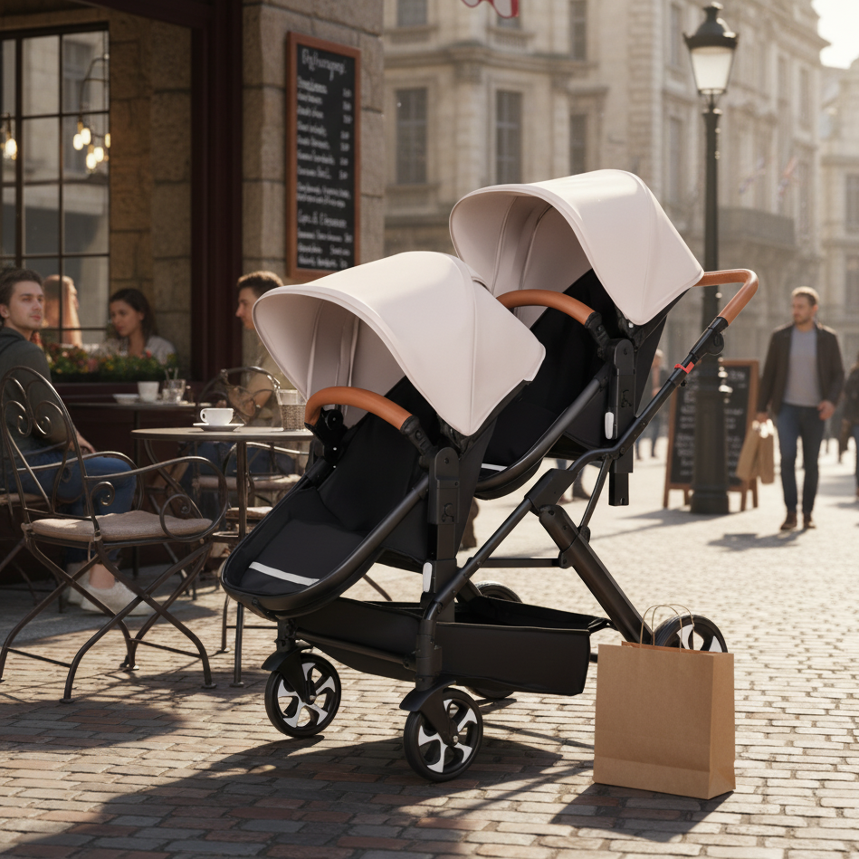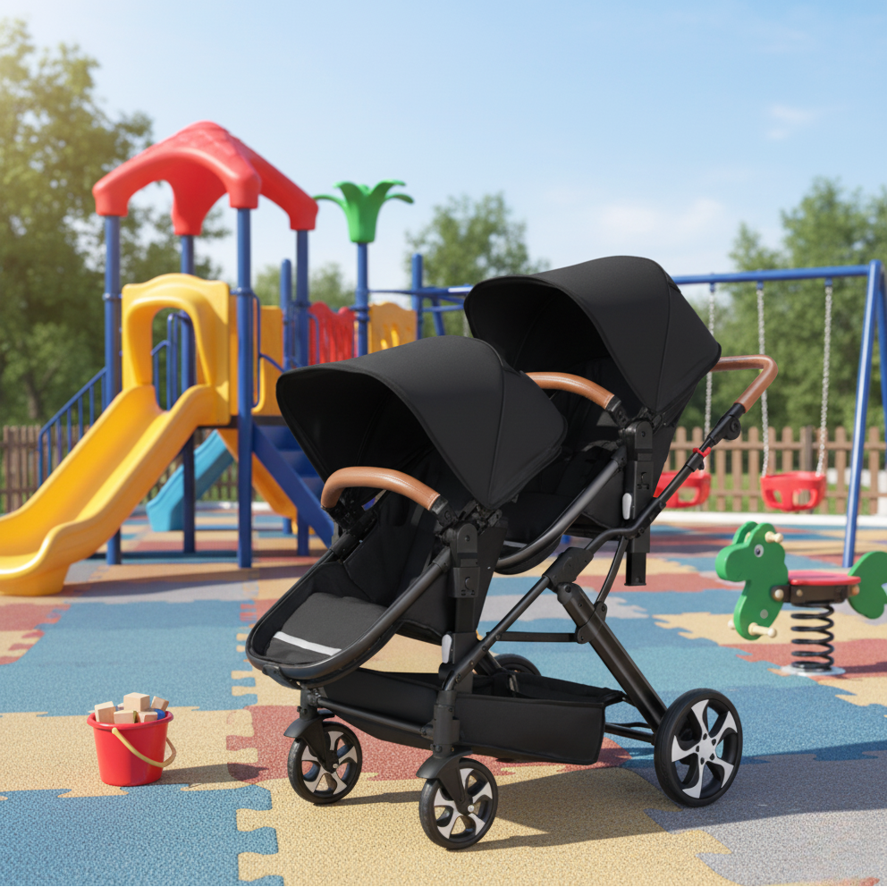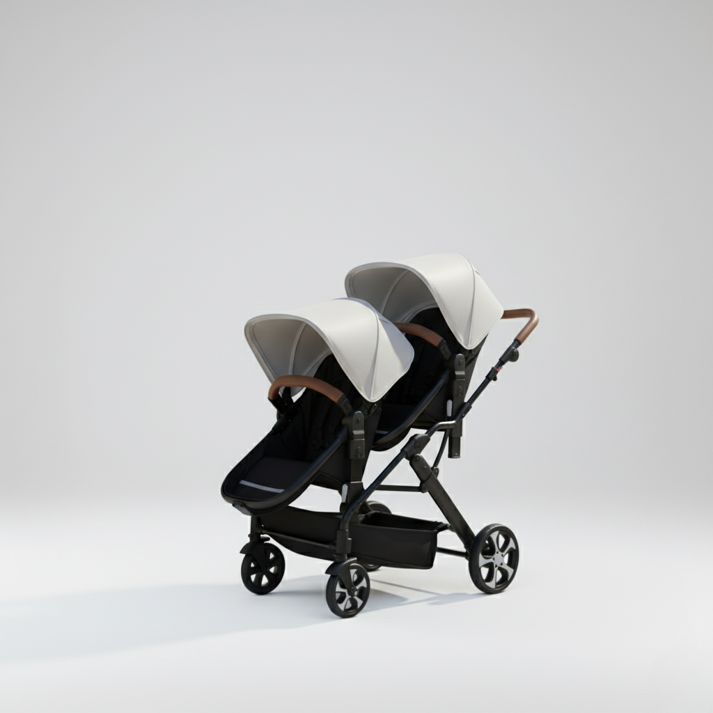 -Poussette double polyvalente : Conçue pour accueillir deux enfants, qu’ils soient jumeaux ou d’âges rapprochés. Chaque siège est indépendant pour offrir un confort personnalisé selon les besoins de chacun.
