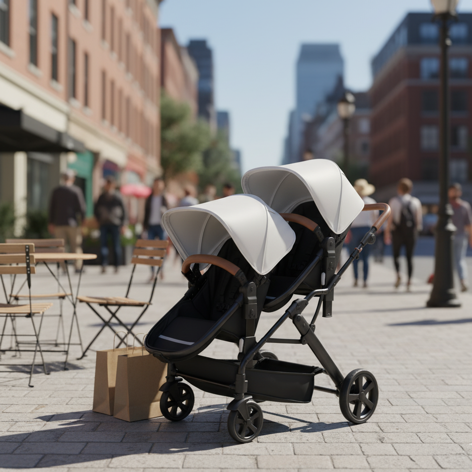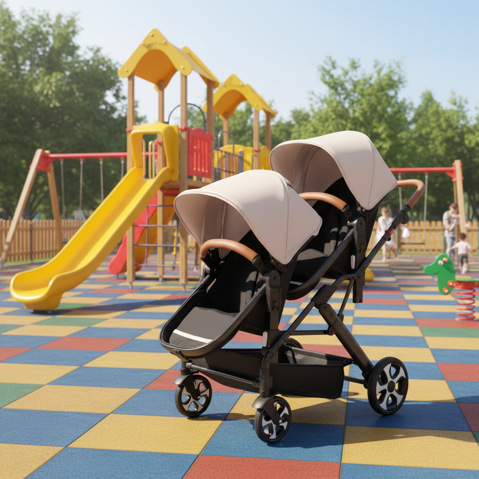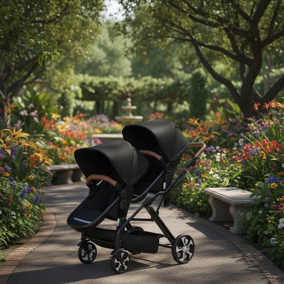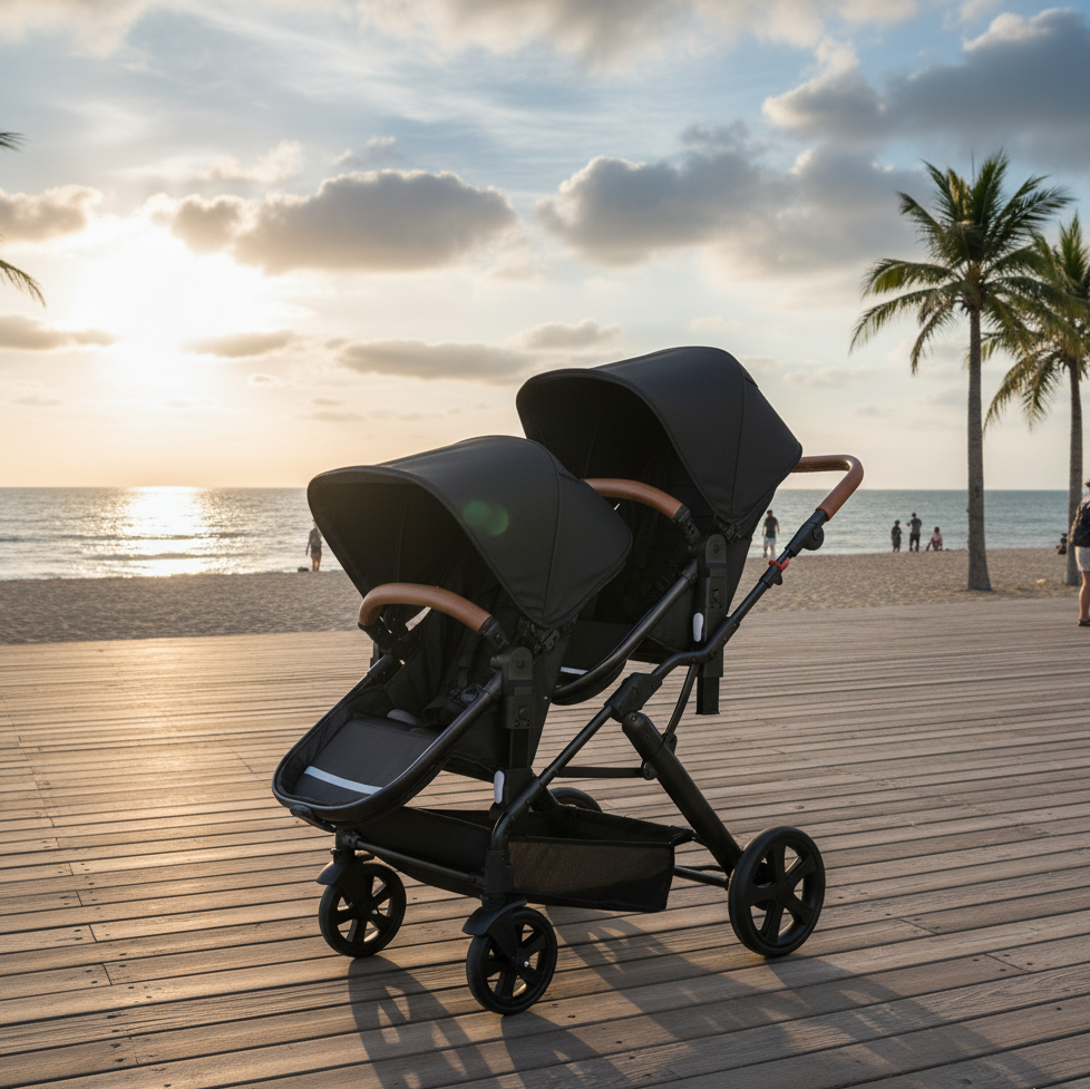 -Poussette double polyvalente : Conçue pour accueillir deux enfants, qu’ils soient jumeaux ou d’âges rapprochés. Chaque siège est indépendant pour offrir un confort personnalisé selon les besoins de chacun.